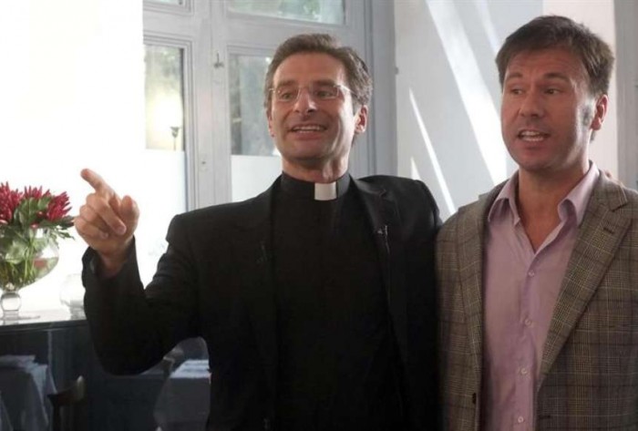 Krzysztof Charamsa e seu companheiro, Eduardo, durante coletiva de imprensa (Foto: EFE)