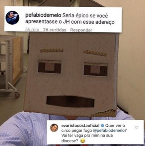 Na imagem, o jornalista aparece com o rosco coberto por uma caixa de papelão, com uma legenda irônica: “Recurso ideal para uma segunda-feira. Bom começo de semana”. O inusitada máscara chamou atenção do padre, que comentou: “Seria épico se você apresentasse o JH com este adereço”.